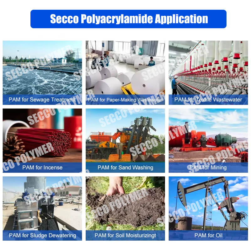 A poliakrilamid emulziót széles körben használják különböző háztartási szennyvízben, kémiai szennyvízben, olajmező szennyvízben, iszap-elvízésben, papírban és más területeken. A poliakrilamid víz-olaj emulziót széles körben használják a városi szennyvízkezelésben, a sörgyárban, a keményítőgyárban, az élelmiszerfeldolgozó üzemekben és más szennyvízkezelésben is. Különösen alkalmazandó a savas vagy savas szennyvízben lévő szerves szuszpenzív szilárd anyagok flokulációjának eltávolítása. A papíriparban retenciós segédszűrőként, papírgyártási szennyvízkezelésként használható. Az olajipar használható fúrási emulziós bevonatszerként vagy zsírmentesítő szerként.
